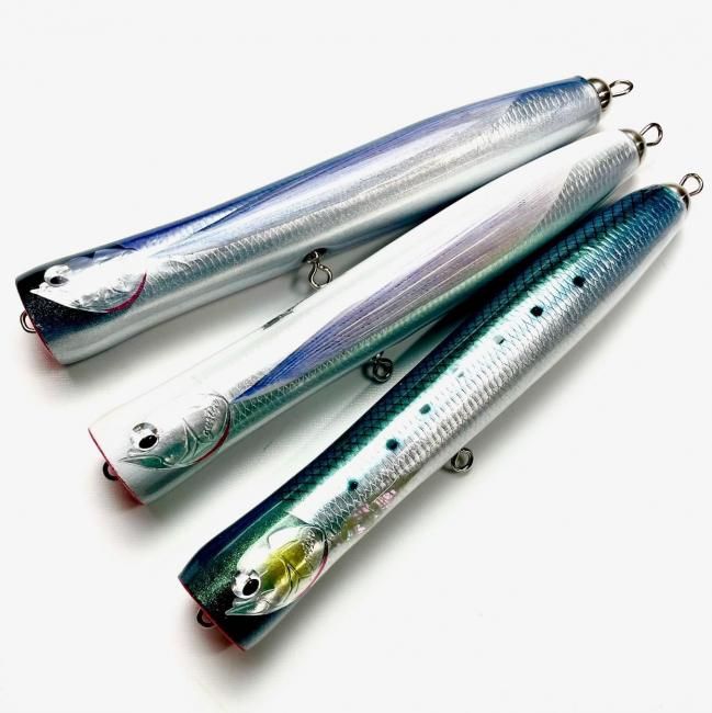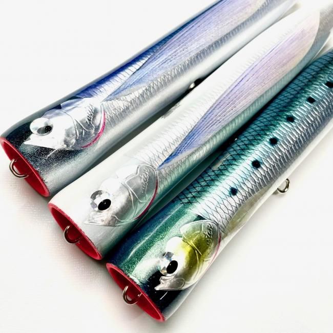 圧倒的な飛距離と深いカップからの大きめの泡とポップ音でマグロを誘います。 特に10号〜タックルでの大型マグロに。 強度も抜群です。 フックは4/0 ゆっくり目のポッピングが良い泡を出すコツです。